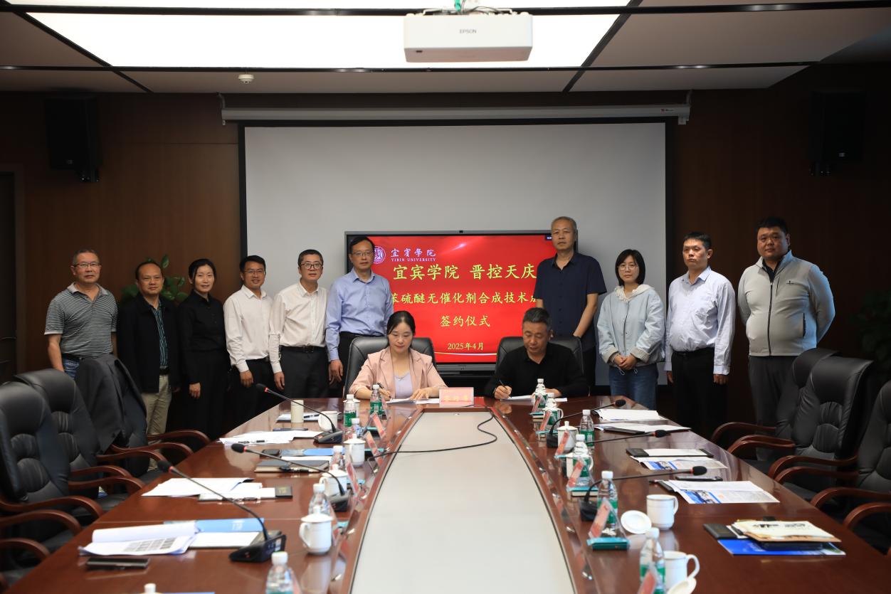 4月23日,宜宾学院与河南晋控天庆煤化工有限责任公司在临港校区行政楼918会议室签署了聚苯硫醚无催化剂合成技术转让合同,到校成果转化金额800万元,实现我校在科技成果转化方向的崭新突破。宜宾学院党委书记马洪江,党委常委、副院长王如渊,副院长覃凤清,河南晋控天庆煤化工有限责任公司党委书记、董事长侯永军,副总经理昝宝龙出席签约仪式。