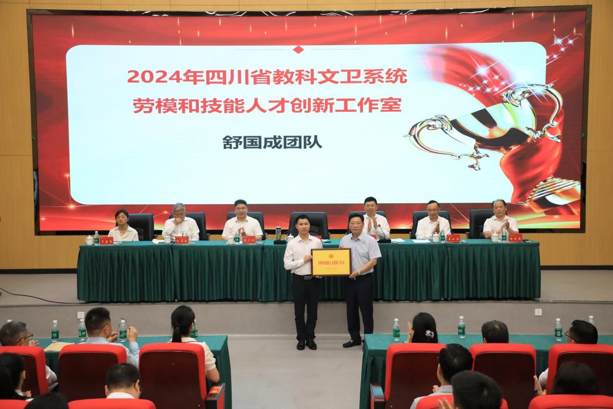 校领导、党委常委分别为工会积极分子、优秀工会干部、先进工作者、美好家庭、工会集体代表颁奖,并向获得2024年四川省教科文卫体系统劳模和技能人才创新工作室的舒国成博士团队授牌。
