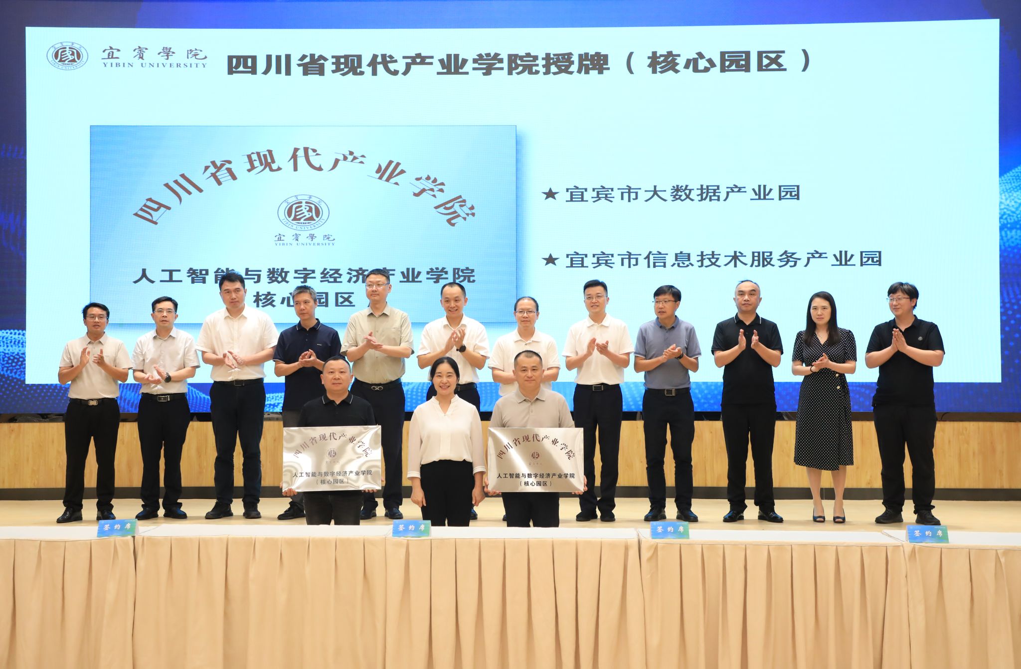 覃凤清代表学校将“人工智能与数字经济产业学院”向市数据局、核心园区、核心企业进行了授牌;校地合作处、计算机科学与技术学院、电子信息工程学院、经济与工商管理学院,分别与高铁南片区,新加入的三家人工智能企业进行产教融合基地签约。