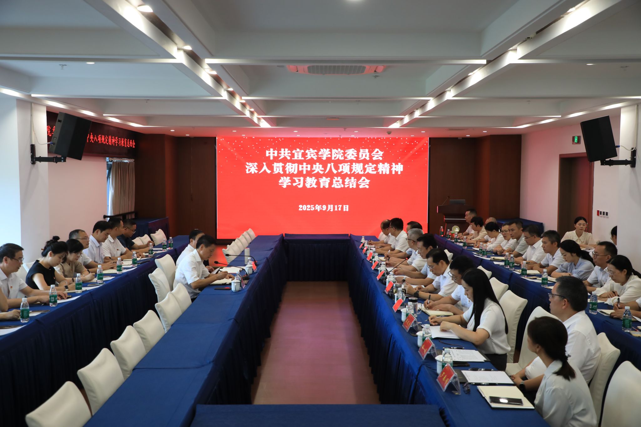9月17日,宜宾学院在临港校区二期行政楼201会议室召开深入贯彻中央八项规定精神学习教育总结会议。省委第五督导组、校领导出席会议,校党委委员、各基层党委主要负责人、学校学习教育工作专班成员参加会议。校党委书记马洪江主持会议并讲话。