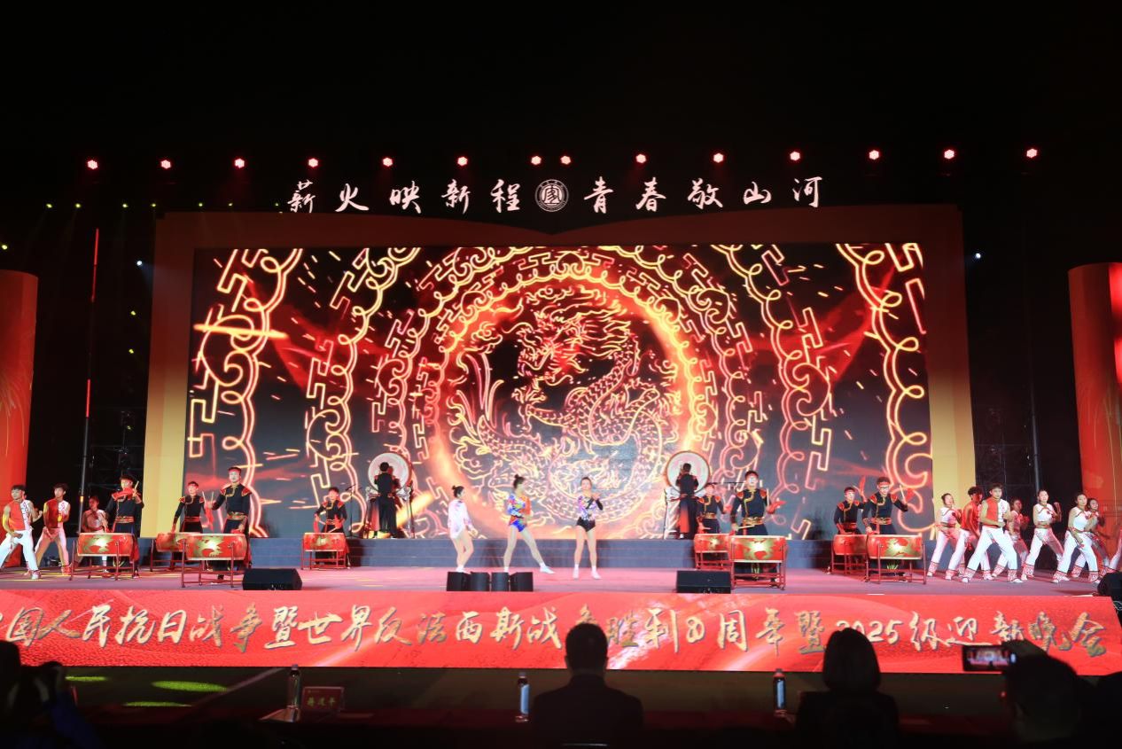 山河无恙,岁月峥嵘;薪火相传,弦歌不辍。为深切缅怀抗战先烈的丰功伟绩,传承红色基因,让青年学子在回望历史中坚定理想信念、续写时代华章,11月9日晚,“薪火映新程 青春敬山河”——宜宾学院纪念中国人民抗日战争暨世界反法西斯战争胜利80周年暨2025级迎新晚会在临港校区足球场举行。线上线下一万余名师生共同观看《青春与信仰 宜宾学院弘扬伟大抗战精神艺术思政大课》,整场晚会通过生动的乐、舞演绎,将红色教育具象化为可感可触的精神滋养,强化了年轻一代对党史与信仰力量的认知。