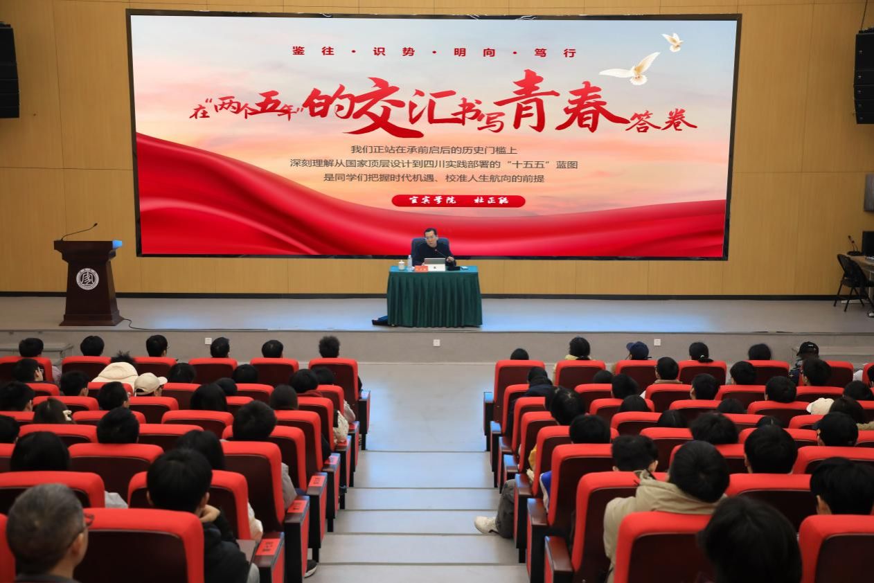 为深入贯彻党的二十届四中全会精神,引导学生读懂弄清“十五五”规划编制的重要意义,鼓舞青年自觉投身现代化建设的火热实践中,1月16日下午,宜宾学院党委副书记、校长杜正聪以《在“两个五年”的交汇书写青春答卷》为题,为联系学院180余名学生讲授了一堂形象生动、素材丰富的形势与政策课。
