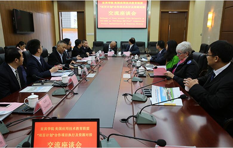 11月9日上午,宜宾学院与美国应用技术教育联盟就“双百计划”项目的执行及资源对接情况在图书馆二会议开展座谈。美国应用技术教育联盟主席Denise博士,联盟中国总裁郭雅琴、副总经理王枫、业务总监李广雨,宜宾市“双城”建设办公室副主任李华、伍小兵,我院党委书记屈川、副院长王藩侯、孟林、周广均出席座谈会,座谈会由副院长鲁飞主持。教务处、发展规划处、国际交流合作处和相关二级学院的负责人参加了座谈会。