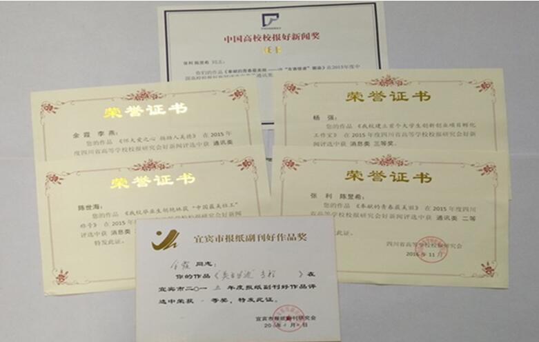 张利、陈昱希撰写的《奉献的青春最美丽》获通讯类二等奖,余霞、李燕采写的《怀大爱之心 扬助人美德》获通讯类三等奖,余霞设计排版《宜宾学院报》2015年第17期文艺副刊获版面类三等奖,《我校建立首个大学生创新创业项目孵化工作室》、《我校毕业生胡艳林获“中国最美社工”称号》获消息类三等奖。