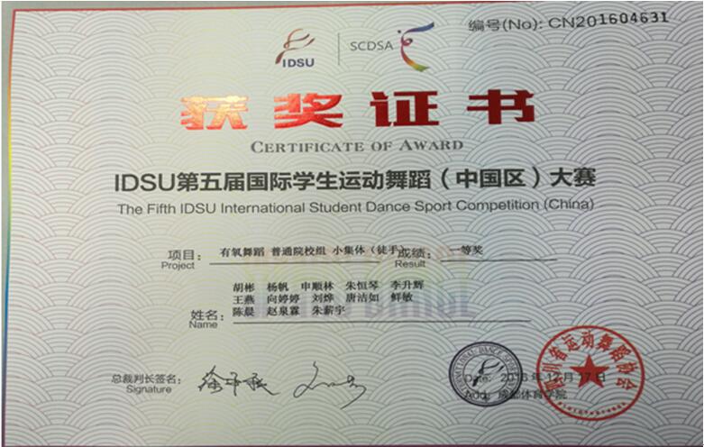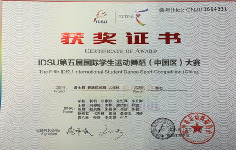 12月16-18日,IDSU第五届国际学生运动舞蹈(中国赛区)大赛在成都体育学院举行,由体育学院派出24名学生组成的我院代表队参加比赛,并获得2项一等奖和1项二等奖的好成绩。