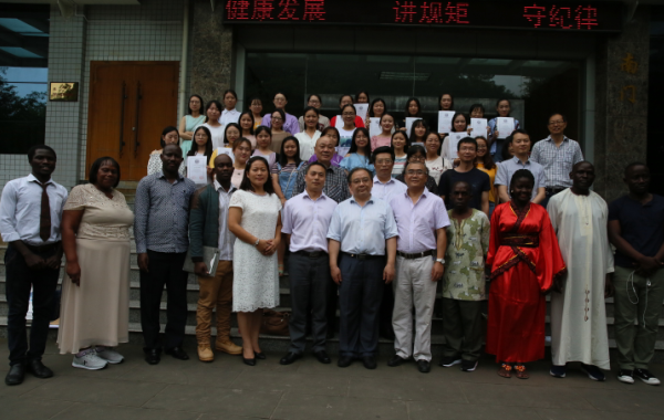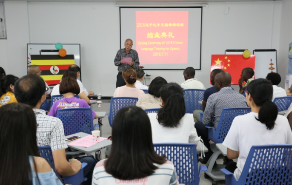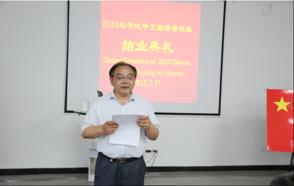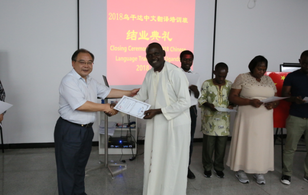 程光照副局长、舒小丽友好大使也在典礼上作了讲话,分别对中文培训的圆满结束表示祝贺,并希望中乌友谊地久天长。王藩侯代表学校分别为10位乌干达培训学员颁发了培训班结业证书并为学生助理颁发了证书。