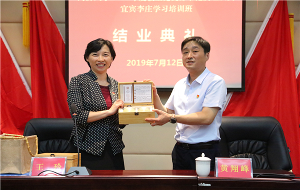 同济大学党委常委、党委组织部长黄翔峰在仪式上讲话。他首先回顾了本次主题培训的基本情况。他指出,此次活动同济大学党委高度重视,组织部精心筹备,提出了“守初心、担使命、找差距、抓落实”的学习要求,培训班成员通过培训了解了宜宾市情、抗战文化、革命先烈英雄事迹和同济在李庄办学的历史,坚定了“与祖国同行、以科教济世”的信念,在思想政治上接受了一次洗礼,理论学习上有收获,工作实务上有提升。其次,他强调,党支部书记和组织员是党建工作的中坚力量,要做好新时代新形势下高校党建工作,提升基层党组织的组织力,就要求我们这支队伍围绕全国党建示范高校的“四个过硬、五个到位、七个有力”,对标同济大学建设中国特色世界一流大学的党建要求,进一步提高思想认识和政治站位,进一步提高自身政治理论水平和学习能力,进一步加强党建工作和学校中心工作、自身业务工作的融合,切实提升自身的党性修养和党务工作能力,以实际行动积极投入到下半年学校的各项重点工作中去,取得工作实效。最后,他对宜宾学院对于此次培训的大力支持表示衷心感谢。