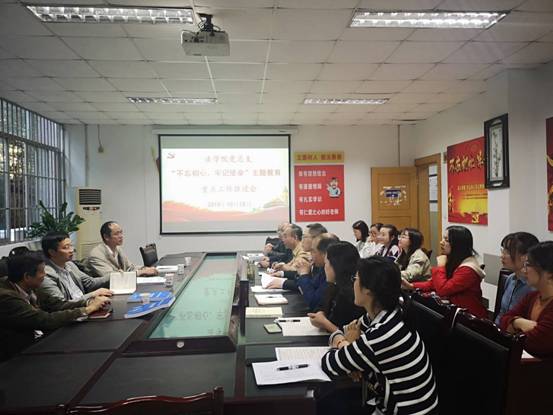 在法学院党总支,法学院党总支书记蒲东升同志简要汇报了党总支基本状况与主题教育开展情况。负责行政工作的刘廷华同志汇报了在“不忘初心、牢记使命”主题教育中,如何把主题教育融入到人才培养,与实践教学有效结合,成立了宜宾学院法律援助工作站、四川省法律援助研究所,取得的良好的社会效果,也支持学科建设。社工专业教师党支部书记陈世海同志汇报了把“不忘初心、牢记使命”的主题教育与专业培养教育有机结合,积极推进申硕工作,尤其是党员师生在工作中勇于担当,甘于奉献的情况。巡回指导组成员对法学院在“不忘初心、牢记使命”主题教育工作中取得的成绩给予了充分肯定,希望法学院能够更好总结提炼主题教育工作中的亮点,把主题教育开展的有声有色,取得更大更好的成绩,实现理论学习有收获、思想政治受洗礼、干事创业敢担当、为民服务解难题、清正廉洁作表率的五个目标。