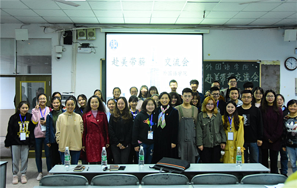 10月25日下午16:00,由外国语学院团总支主办的赴美带薪交流会在二教楼502教室正式举行。宜宾学院党委副书记、院长王玲,外国语学院书记罗春雁,副书记温萍,副院长赵亚玲以及老师同学们一同参加了交流会。