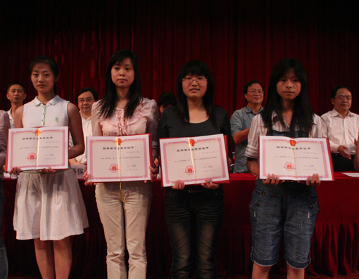(星期三)下午4 点半,我校在三平台艺术楼演播厅隆重举行了2007——2008学年度“国家奖学金”、“国家励志奖学金”、“学校优秀学生奖学金”颁奖大会,来自全校各系(院)的27名“国家奖学金”获奖学生、368名“国家励志奖学金”获奖学生、3932名“学校优秀学生奖学金”一、二、三等奖获奖学生受到了表彰及奖励。